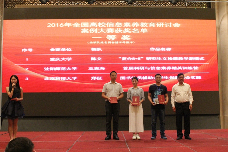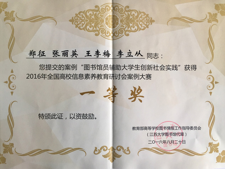 2016年9月中旬,教育部高等学校图书情报工作指导委员会主办的“全国高校信息素养教育大会”在江苏镇江市召开,来自全国30个省的200余所高校的近350名代表参加了会议。本次会议还进行了“全国信息素养教育研讨会案例大赛”评比,由我校图书馆郑征等人提交的《图书馆员辅助大学生创新社会实践》案例荣获一等奖,并且郑征应邀在大会上交流发言。另外两名一等奖分别来自重庆大学和沈阳师范大学。
