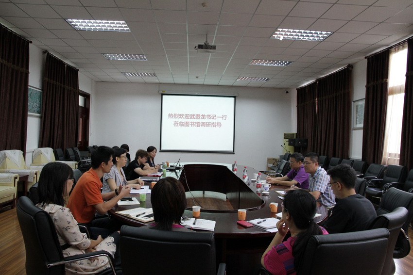 9月6日下午2:00,校党委书记武贵龙带队莅临图书馆,调研指导图书馆工作,并与图书馆相关人员亲切交流座谈。党、校办副主任吴豪伟以及图书馆馆长、副馆长和各部室负责人参加了会议。