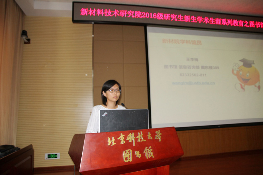 9月6日上午,信息部王李梅老师在图书馆四楼报告厅,配合“新材料技术研究院2016级研究生学术生涯系列教育之图书馆数字资源及服务专题课程”,给新生们开展了一场专题培训,培训主题为《图书馆——您的科研伙伴》,到场师生接近两百人。