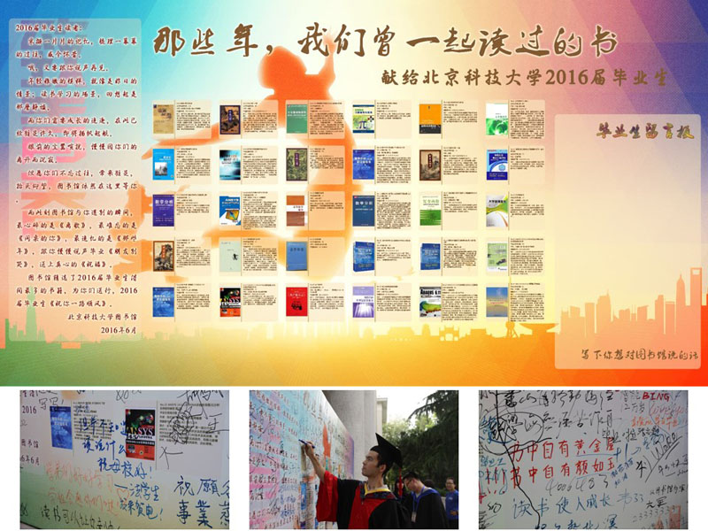 “那些年,我们一起读过的书”活动在延续以往展示毕业生借阅书目排行榜的基础上,增加了读者留言板,为即将毕业的同学了提供一个回首往昔,展望未来,书写寄语的平台,该活动形式丰富多样,参与气氛热烈。毕业生们在留言板上畅所欲言,“以图书馆为家”“读书使人成长”“毕业快乐”“我爱北科大”等一条条留言,都展示了毕业生美好的祝愿。