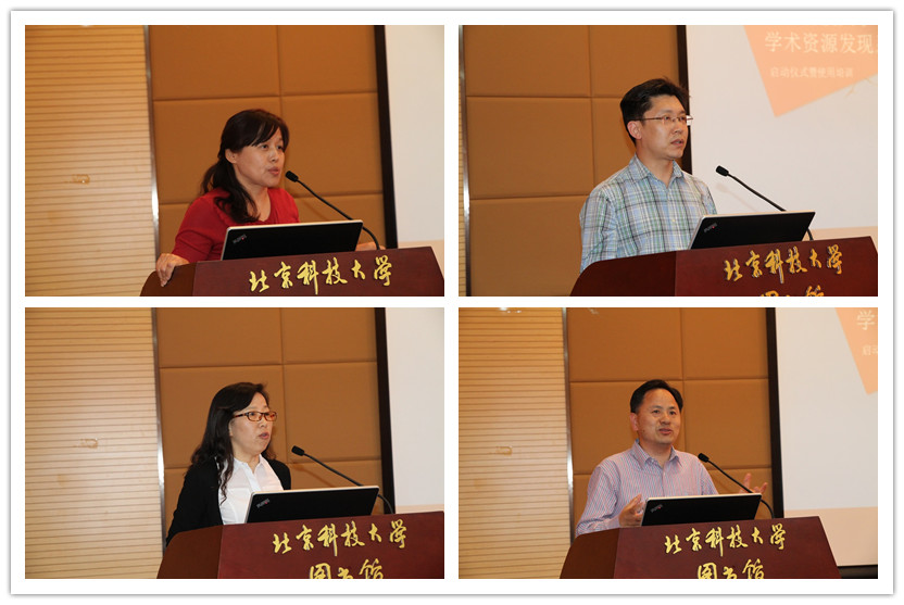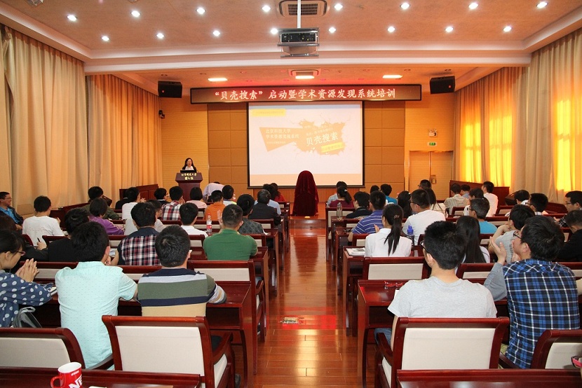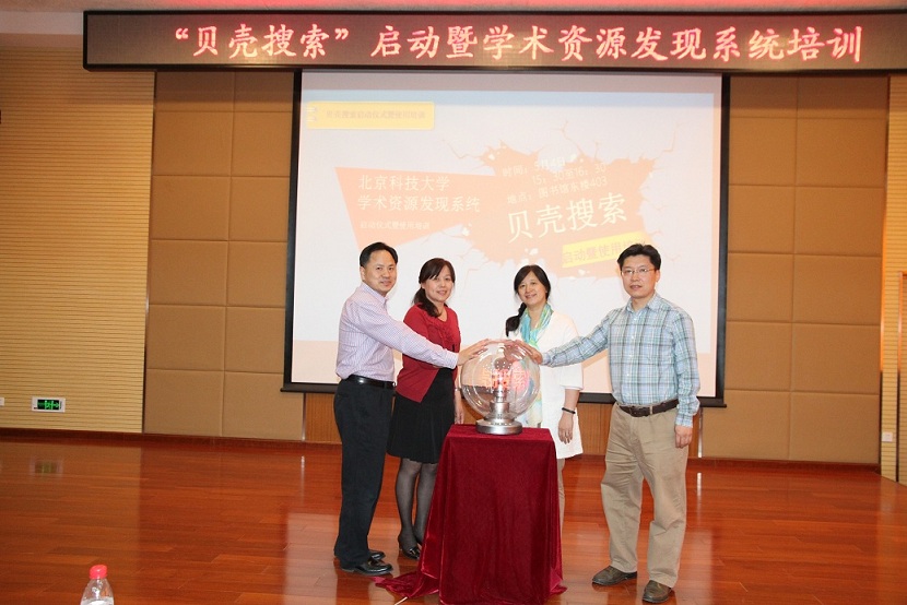 2015年5月4日,北京科技大学“贝壳搜索”启动仪式暨学术资源发现系统培训活动在图书馆四楼报告厅举行。北京科技大学资产管理处处长林林教授、教务处副处长申亚男教授、图书馆馆长季淑娟教授、Ex Libris艾利贝斯有限公司北京代表处首席代表沈辅成出席启动仪式并致辞。活动得到了全校师生的热烈响应,来自校内其他院系的师生和本馆职工共计150余人参加了该活动。此次活动由图书馆王瑜副馆长主持。