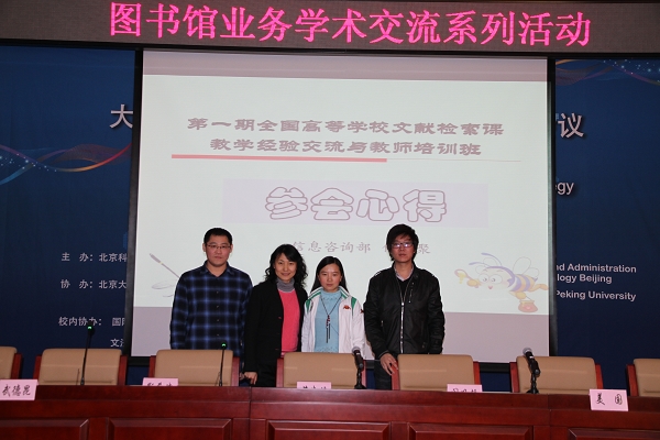 今年图书馆选派馆员参加了多场图书馆届的学术交流活动。为提高馆员的业务水平,促进馆内交流,10月28日图书馆在东楼四层报告厅组织了一次内部学习,由参加交流活动的赵秀君、何欢聚、周远松、赵萌萌四位教师分别与大家分享了活动主要内容与心得。