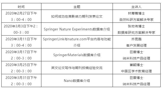 2020年春季学期伊始,为了帮助广大师生更好地利用Springer Nature各大平台提供的资源,更有效率地开展科研工作、发表科研成果,Springer Nature全新推出系列在线培训。