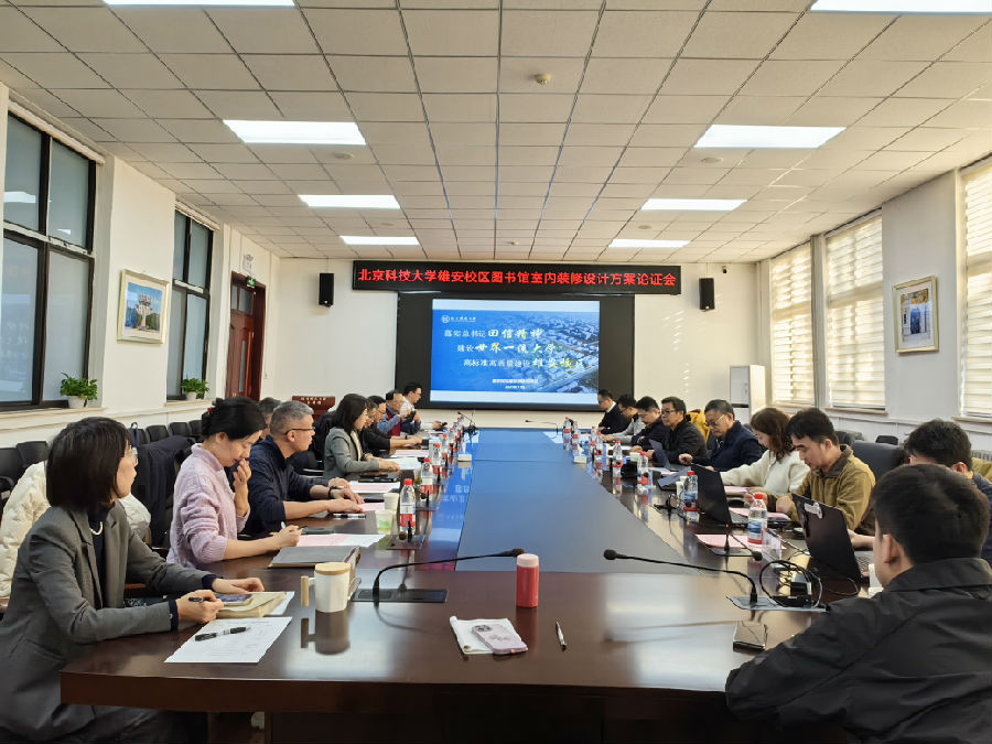 2025年11月18日上午,北京科技大学雄安校区图书馆室内装修设计方案论证会在图书馆会议室顺利召开。论证会专家组由浙江大学新馆建设总监瞿晶、东南大学图书馆原馆长顾建新、中国农业大学图书馆副馆长段文凯、北京航空航天大学图书馆副馆长侯毅、北京科技大学机械工程学院工业设计系副主任李淳组成。学校副校长彭庆红、雄安校区建设项目指挥部党委书记兼副指挥长苏栋、指挥部总工程师兼规划设计管理部部长冯建明等参加会议。会议由图书馆馆长王瑜主持。